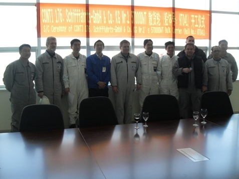 2010年3月10日13:18時,我司為CONTI176.Schifffachrts-GmbH&Co.KG Nr.1德國船東建造的57000DWT散貨輪(船體號:HT041)在新韓通切割中心隆重舉行開工儀式,船東代表:Andrzej Olechnowicz及其夫人、Krzysztof Franczyk 等人;英國勞氏船級社LR代表:李金龍、孫凌峰、曾廣芳;新韓通重工常務副總王友軍、副總潘學軍參加了本次儀式。開工點火后,三方代表共同簽署了開工文件。最后所有人員舉杯歡慶,合影留念。