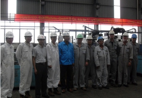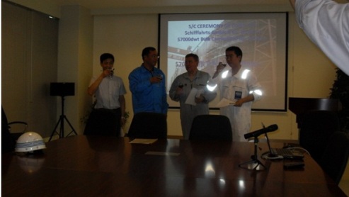 2010年7月12日14:48時,我司為CONTI177.Schifffachrts-GmbH&Co.KG Nr.1德國船東建造的57000DWT散貨輪(船體號:HT042)在新韓通切割中心隆重舉行開工儀式,船東代表:Andrzej Olechnowicz、Krzysztof Franczyk 等人;英國勞氏船級社LR代表:李金龍、孫凌峰、曾廣芳;新韓通重工副總周義慶參加了本次儀式。開工點火后,三方代表共同簽署了開工文件。最后所有人員舉杯歡慶,合影留念。