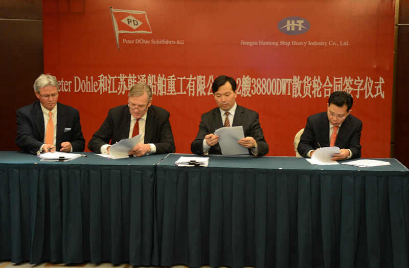 2013年4月19日,我司與德國船東Peter DÖhle在文景國際大酒店簽訂3+2艘38800DWT散貨船合同(SDARI設計)。該批訂單將于2015年第二季度開始交付,公司堅持做專做精的經營策略。該船型將與64000DWT散貨船并行為韓通船舶主打船型并系列生產。