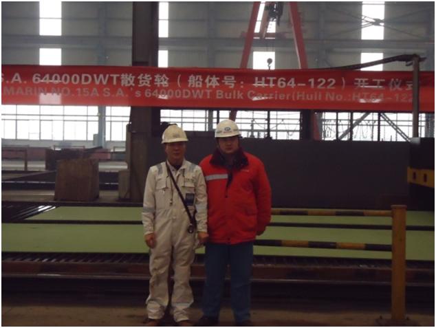 2013年12月6日,新韓通為Kmarin船東建造的64000噸散貨輪(HT64-122)成功舉行開工儀式,新韓通準備車間主任陳偉偉及船東船檢參加本次儀式。