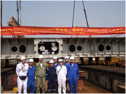 2014年6月12日上午15:18分,新韓通為Albemarle船東建造的64000噸散貨輪(HT64-170)成功舉行上臺儀式,新韓通總經理助理圣衛兵及船東船檢參加本次儀式。