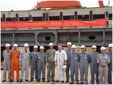 船東建造的64000噸散貨輪(HT64-150)成功舉行上臺儀式,新韓通總經理助理圣衛兵及船東船檢參加本次儀式。