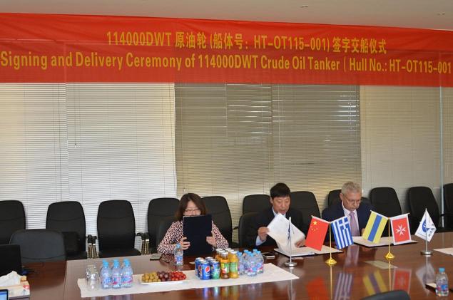 1st 114K oil tanker (Hull No.: HT-OT115-001) is delivered, and 3rd 114K oil tanker (Hull No.: HT-OT115-003) is undocked, whose owner is Greece CARDIFF. The vessels are classed by ABS and designed by SDARI, with length of 250.00m, breadth of 44.00m, and depth of 21.50m, suitable for world-wide service.