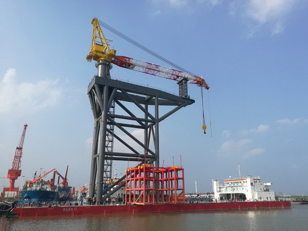 2018年8月10日,我司為南通海洋水建建造的海洋風(fēng)電52起重安裝船順利交付。該船長(zhǎng)128M,寬38M,型深6.5M,起重高度120M,吊重650T,可用于深水區(qū)打樁、潮間帶4兆瓦以上風(fēng)機(jī)安裝。